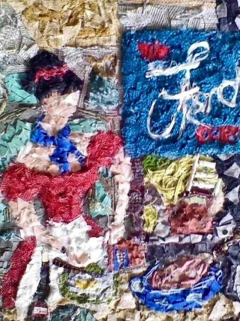 First, I draw my design on paper and gather up all of my luscious fabrics from my cache. Materials come alive and speak to me. Sometimes I even rip apart a skirt, blouse, jacket, trousers, bathing suit, or a nightgown. Nothing but nothing is sacred in my creation of making art!
